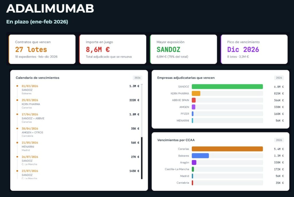 Los dos períodos de mayor concentración de vencimientos son abril de 2026 (1,8M €, fundamentalmente Canarias) y diciembre de 2026 (3,2M €, también Canarias). Para los laboratorios que buscan ampliar su presencia en el mercado canario de adalimumab, estas fechas representan las ventanas de entrada más relevantes del año.